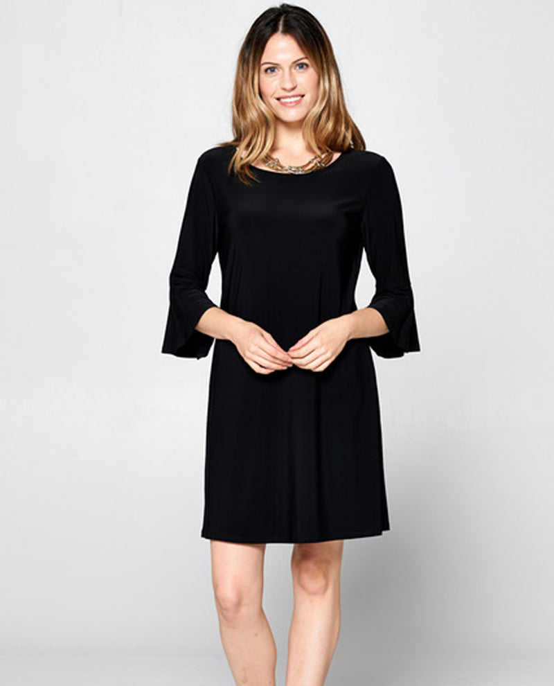 This By JJ dress is great for the holidays and dressy fall events! The 3/4 bell sleeves add the perfect finishing touch. The hem hits slightly above the knee on average. Like other By JJ clothing, this is made of an extremely comfortable stretchy fabric. No one will ever know that this dress is as comfy as pajamas!