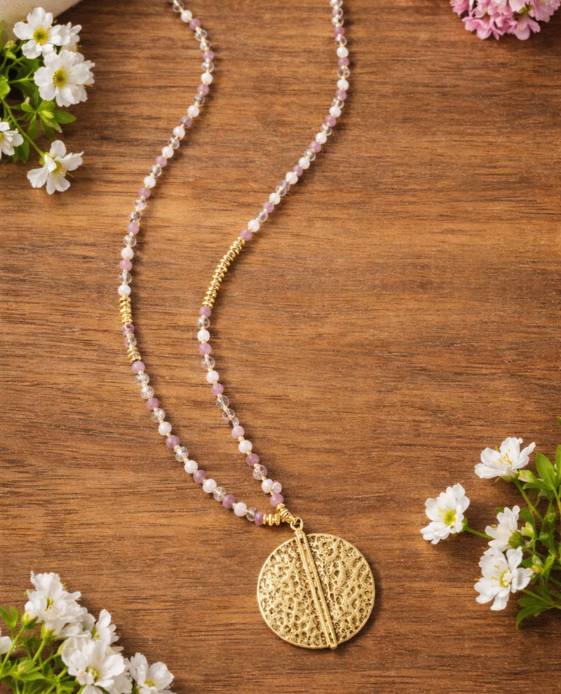 Elevate your everyday style with this stunning beaded necklace featuring delicate lavender crystals and a gleaming gold round pendant. The soft, calming hue of lavender pairs beautifully with warm gold accents, creating a versatile piece that complements any outfit. Whether you're dressing up for a special occasion or adding a touch of elegance to casual wear, this necklace brings sophistication and charm to your jewelry collection. A timeless accessory that makes you feel confident and radiant.