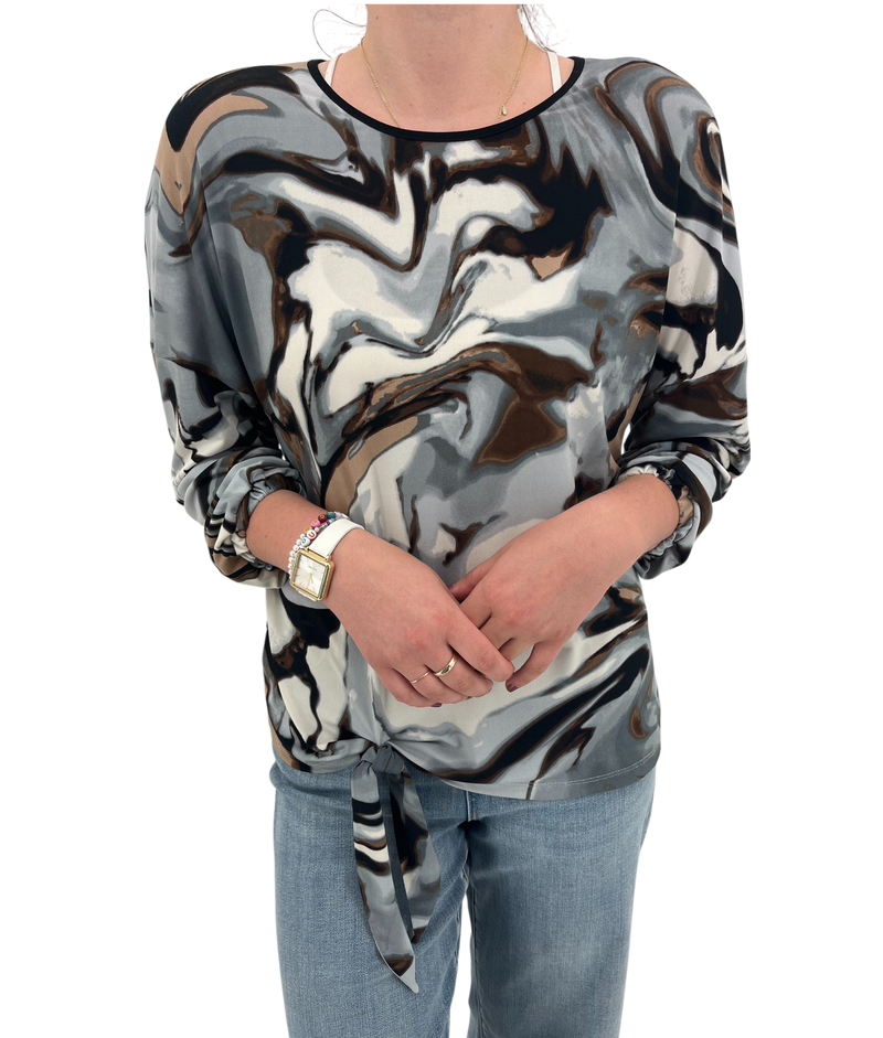 This silky top is a great desk to dinner choice! The black, white, and gray marbled print also features hints of brown, making this a great top to wear with your neutral color pants. The sleeves are gently gathered with relaxed elastic cuffs. For a couple more details, the neck is trimmed with black piping and the hem has a tie.