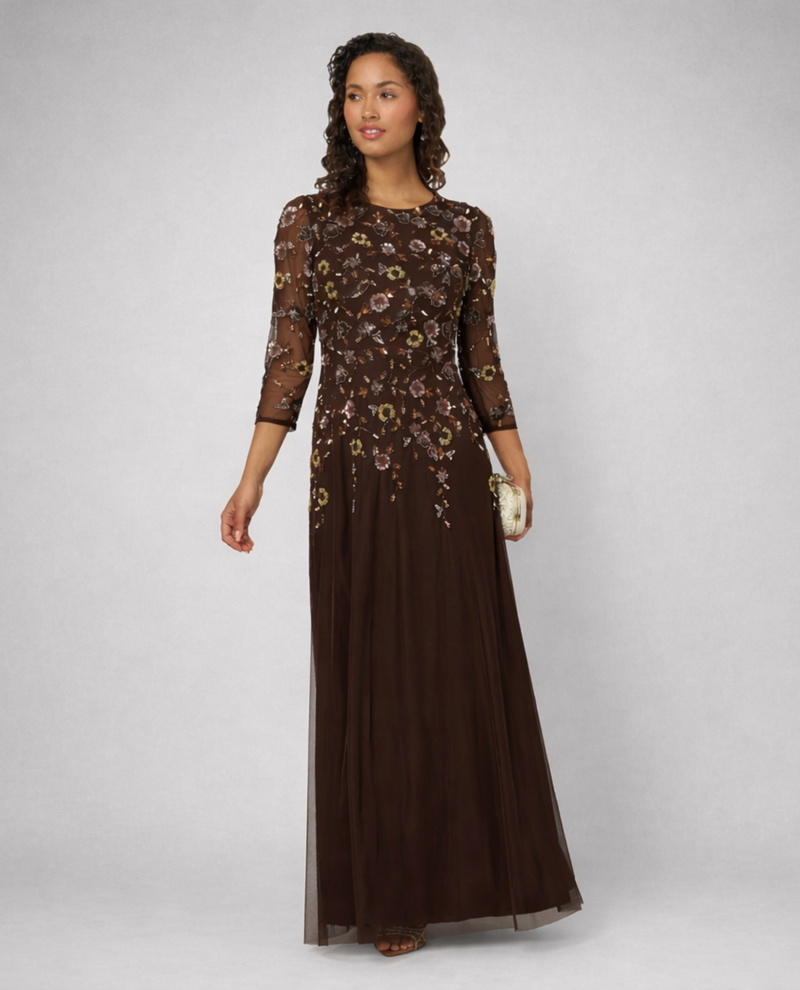 Turn heads with this stunning Adrianna Papell beaded mesh long dress. Intricate floral beadwork adorns the sheer mesh overlay, creating a unique and femine look. The flowing length and sophisticated design offer timeless glamour with modern appeal. Whether you're attending a wedding, gala, or upscale event, this three-quarter dress delivers the refined elegance you deserve.