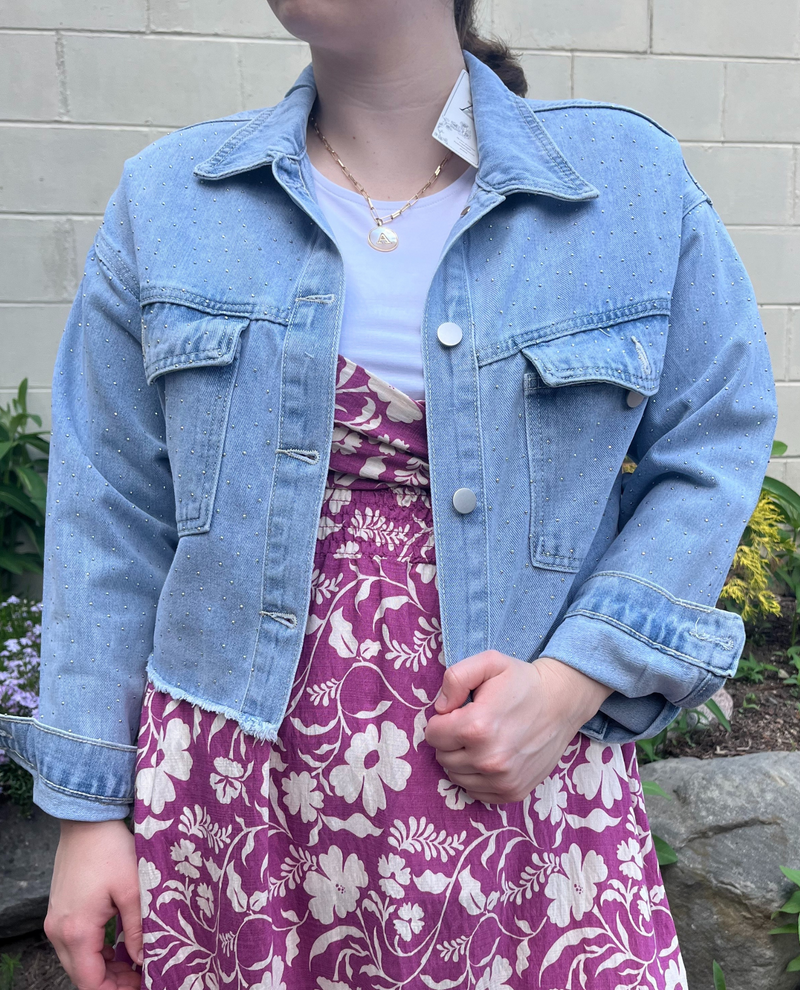 This cropped jean jacket looks adorable on petite ladies and short-waisted ladies. It features classic styling with long sleeves, a button front, and two large patch pockets. The frayed hem adds a casual touch, while tiny stones add a hint of sparkle to the body and sleeves.
