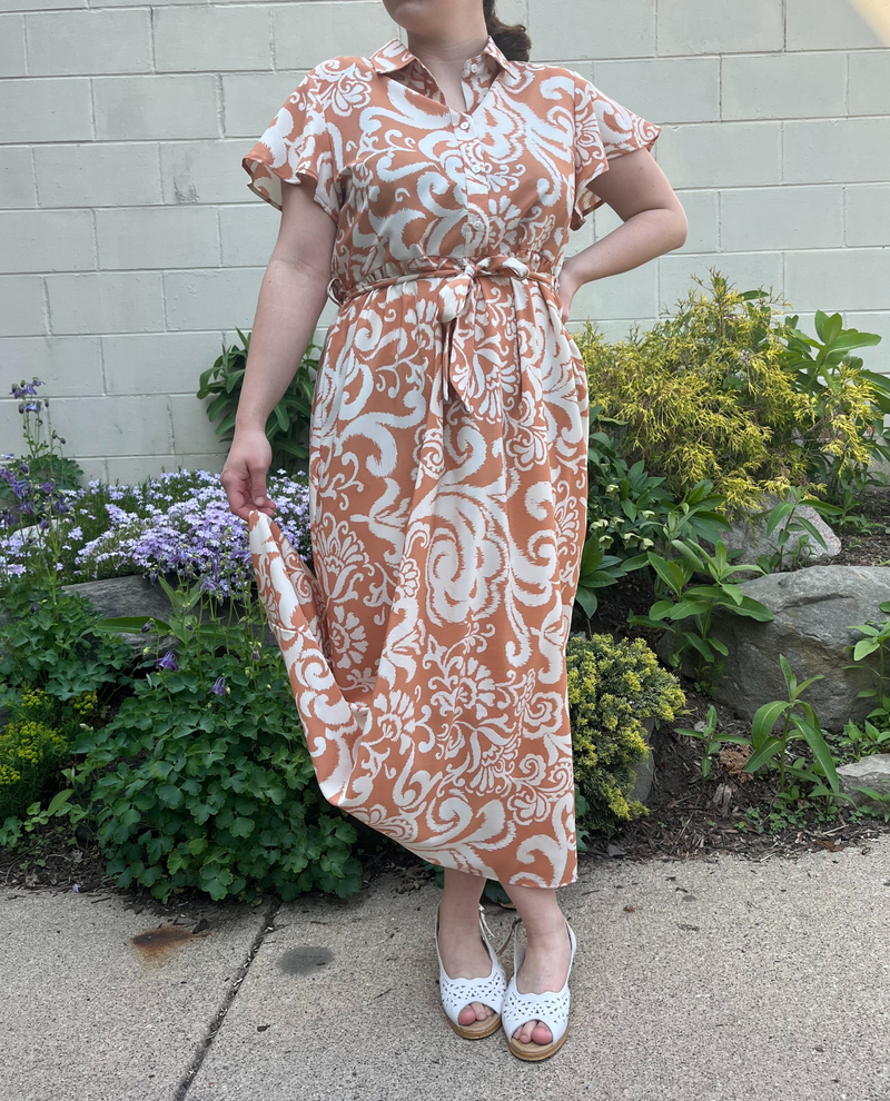 This dress is nothing short of lovely! Wear it to graduations, showers, church, weddings, and more. A bold print adds a fun touch. Flowy sleeves cascade over your arms, while a collar adds a touch of structure. This self belted dress includes buttons on the front bodice.
