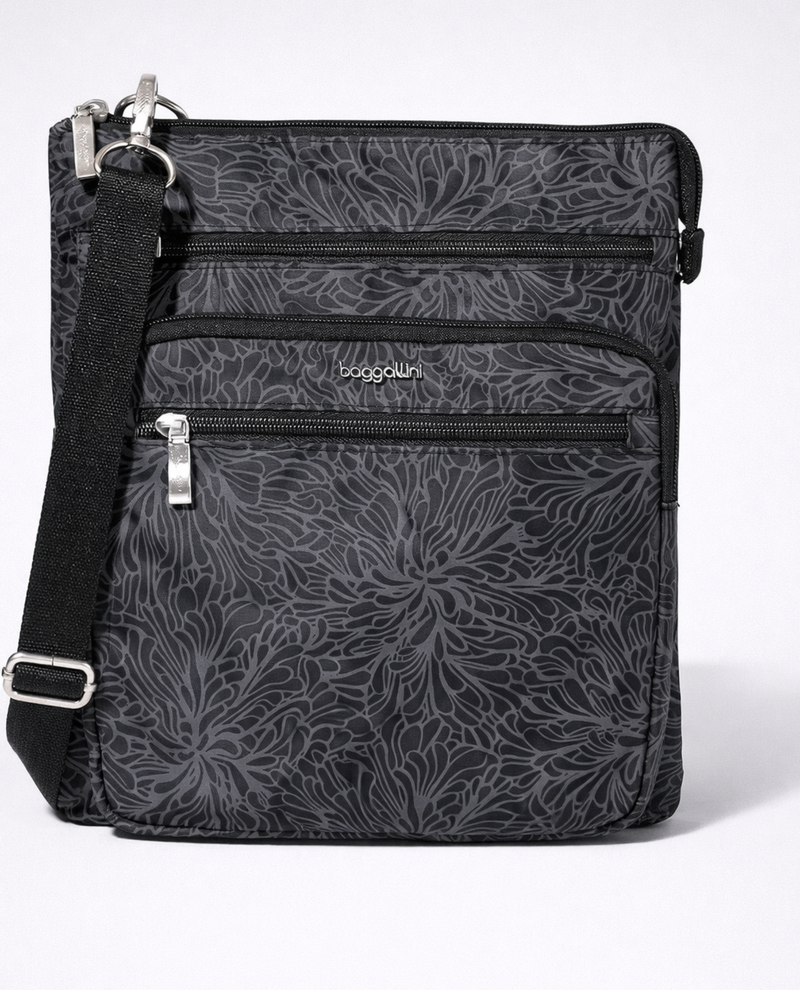 Stay organized on the go with the Baggallini Out and About Crossbody Bag. This thoughtfully designed bag features two divided interior compartments plus a hidden privacy pocket to keep essentials within easy reach. The RFID-protected front pocket secures your cards safely, while eight additional pockets, a key leash, and a pen holder ensure everything has its place. Made from durable nylon with a detachable crossbody strap and secure zipper closure, it's the perfect companion for daily adventures.