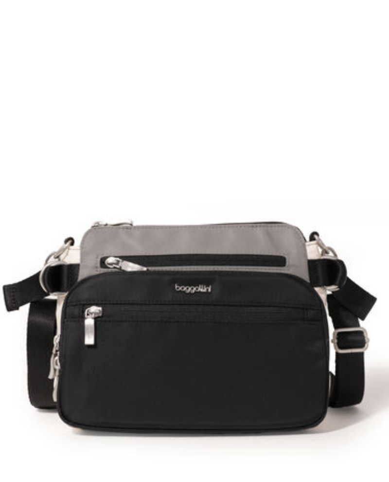 Stay organized on the go with the Baggallini Out and About Crossbody Bag. This thoughtfully designed bag features two divided interior compartments plus a hidden privacy pocket, so everything has its place. The RFID-protected front pocket keeps your cards secure, while eight total pockets, a key leash, and a pen holder ensure you're always prepared. Made from durable nylon with a detachable crossbody strap and reliable zipper closure, it's the perfect companion for daily adventures.