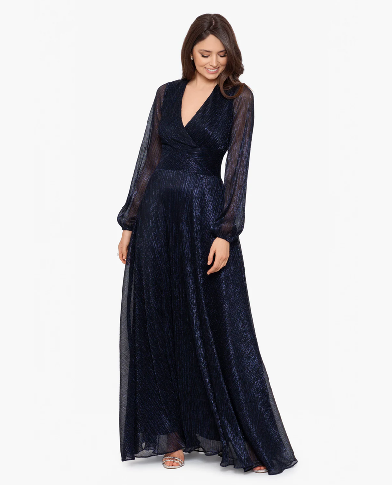 This stunning metallic long-sleeve wrap gown from Betsy & Adam is a classy choice for special events. The V-neck front and shimmering fabric create an effortlessly sophisticated style perfect for formal occasions. The wrap styling offers flattering coverage while the metallic finish catches the light beautifully, ensuring you'll feel confident and radiant all night long. This long sleeve gown is an ideal choice for galas, weddings, or any special event where you want to make a memorable impression.