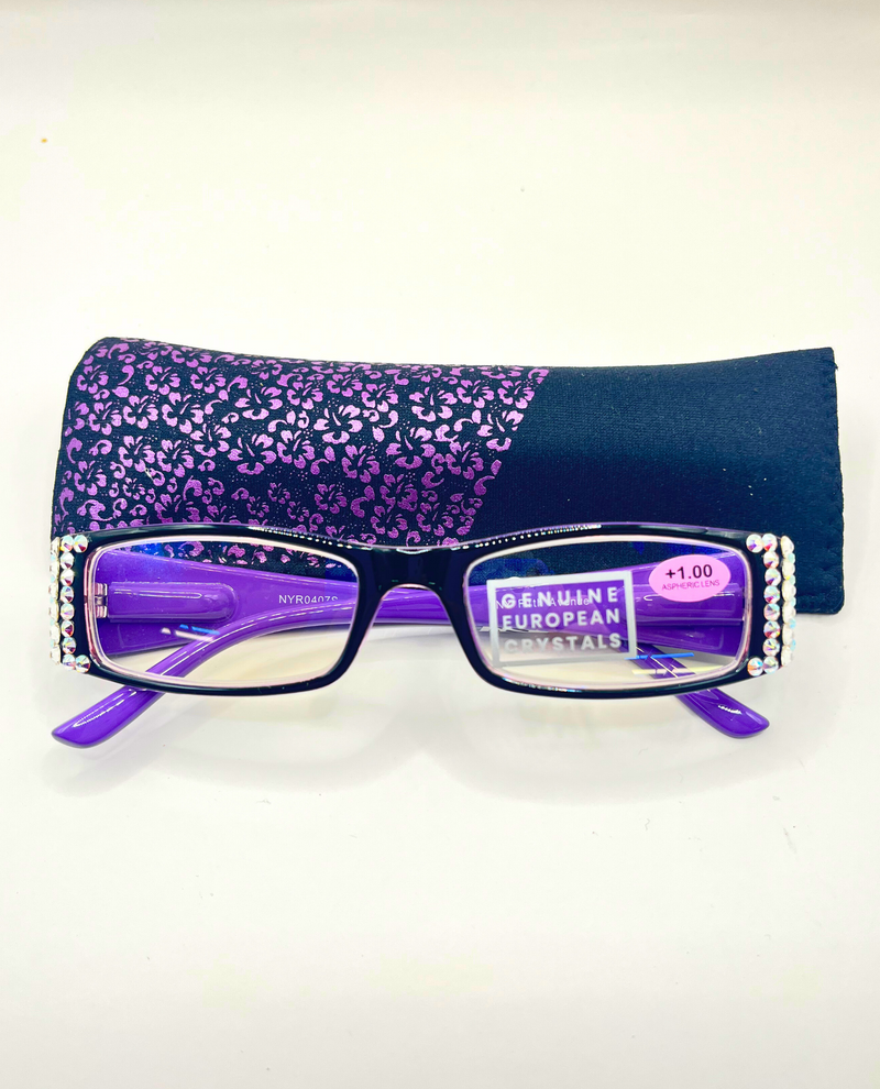 Add a pop of color and clear vision with the BLING READER. Designed to provide comfortable reading support, these glasses combine style with practical use, making your daily reading easier and more enjoyable. The vibrant purple, red, and black frames are enhanced with rhinestones, adding a fun, confident touch to your look while ensuring clarity and comfort. Each pair of reading glasses includes a fun case.