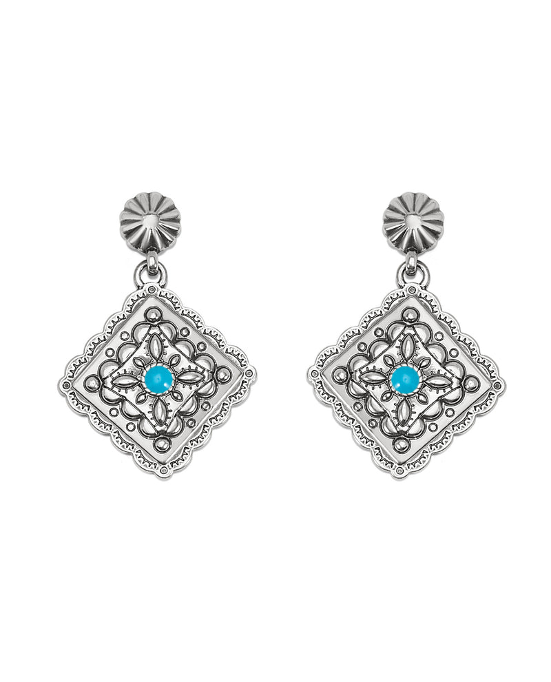 Inspired by traditional silver concho styles, this southwest-influenced earring features etching and a turquoise hand-enameled center for a cool boho look.