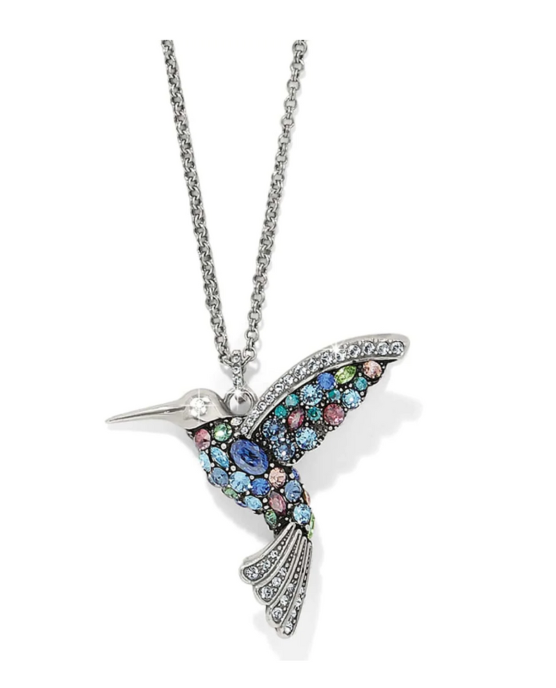 The hummingbird pendant is a radiant symbol of joy and grace, representing intelligence, beauty, devotion, and love in every sparkling detail. Give it as a meaningful gift, or wear it to celebrate who you are. This lovely hummingbird necklace is adorned with a myriad of hand-set clear and colored crystals in varying sizes.