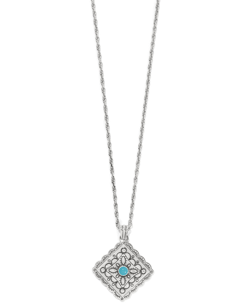 Brighton's history of southwest influence takes another stunning turn In this necklace inspired by silver conchos featuring floral etching and a sculpted, scalloped design at the center and a turquoise hand-enameled "stone."