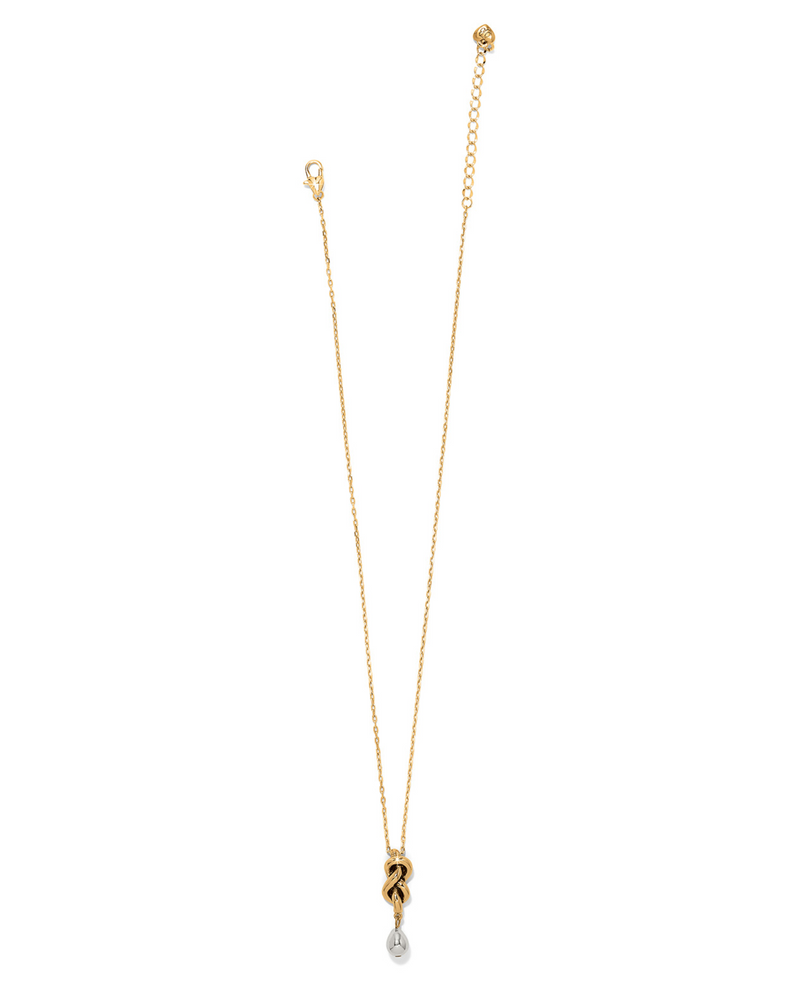 This clean, elegant design embraces modern minimalism, while showcasing intricate craftsmanship. Ultimately, knots remind us of the intricate ties that weave together our experiences and relationships. The north/south knot with a silver drop complements anything you wear.