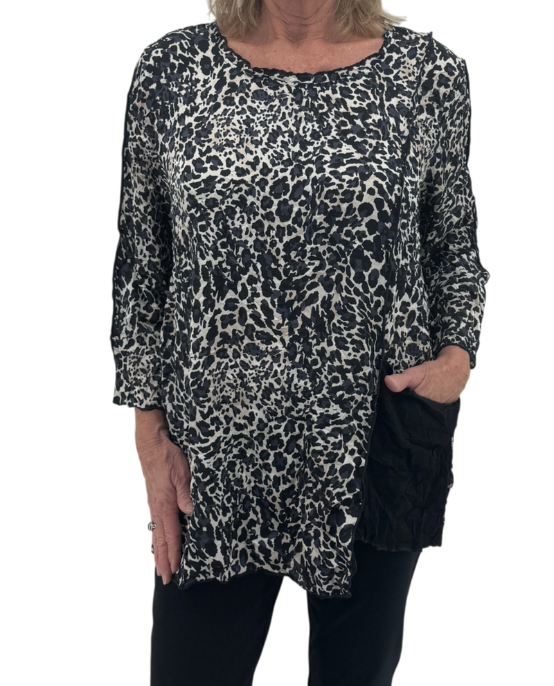 Elevate your everyday wardrobe with this versatile 3/4 sleeve crinkle top from BY JJ. The textured crinkle fabric adds visual interest and dimension to any outfit, while the eye-catching print brings personality to your look. A black patch pocket adds bold contrast. Three-quarter sleeves offer a flattering silhouette that works for various body types and seasons. Whether you're dressing up with accessories or keeping it laid-back, this top is a reliable go-to that supports your personal style.
