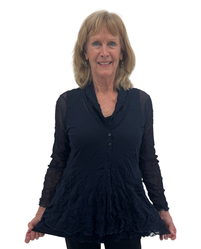 Elevate your wardrobe with this striking BY JJ ME-303 jacket, designed to make a statement. The textured crinkle fabric adds dimension and visual interest, while the sheer mesh panels create an elegant, modern silhouette. The peplum detail at the waist provides flattering structure and a touch of contemporary flair. Perfect for layering over dresses or pairing with your favorite basics, this versatile piece transitions seamlessly from day to evening. Whether you're dressing up for a special occasion or adding polish to casual wear, this jacket offers the confidence and style you deserve.