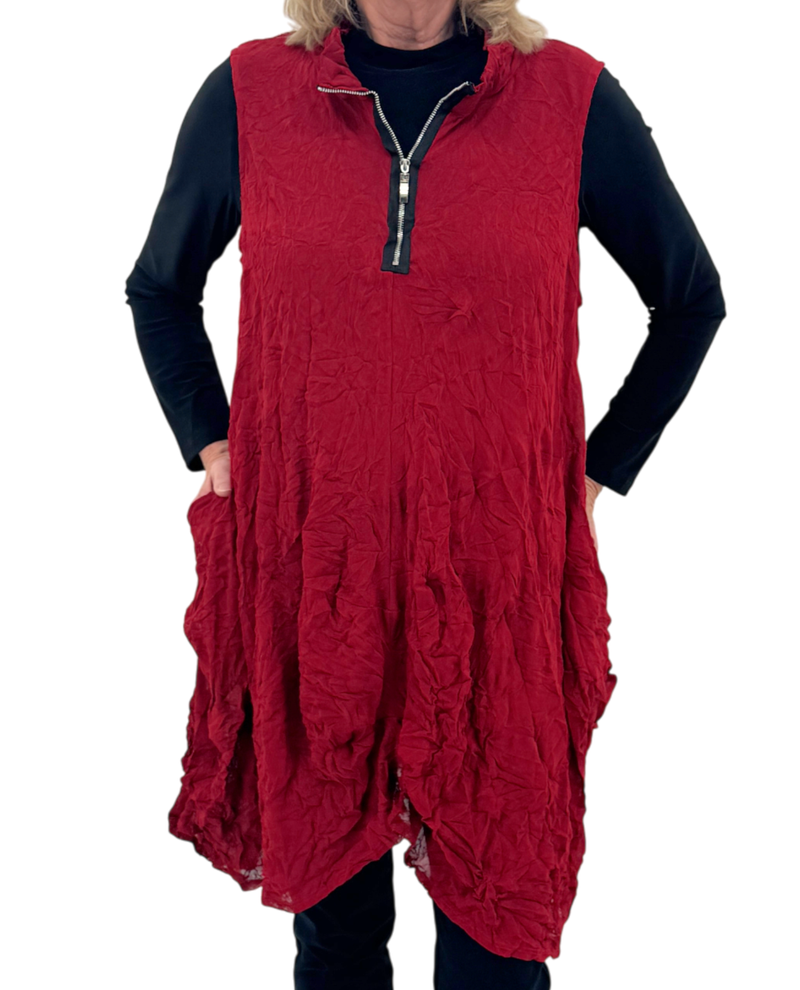 Elevate your casual wardrobe with this versatile sleeveless tunic from BY JJ. The crinkled fabric adds wonderful texture and visual interest, while the zip detail at the neckline brings a modern, functional touch. Perfect for layering over your favorite tee or wearing solo, this piece transitions seamlessly from day to night. The relaxed silhouette offers comfort without compromising on style, making it an essential addition to any closet. Pair it with jeans, leggings, or trousers for effortless, polished looks.