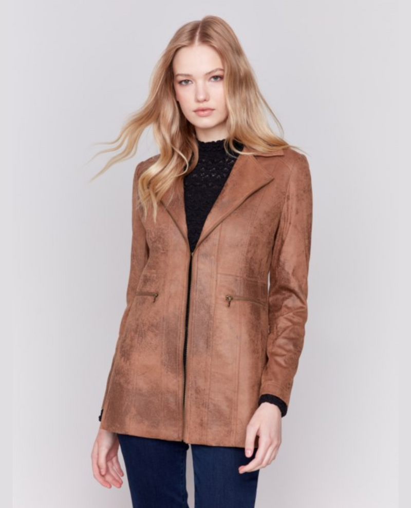 This vintage-look faux suede jacket is an elegant menswear-style piece. The collar is trimmed with a tone-on-tone zipper, and a hook and eye closure secures the front. This long, stretchy jacket also has two working pockets with zippers.