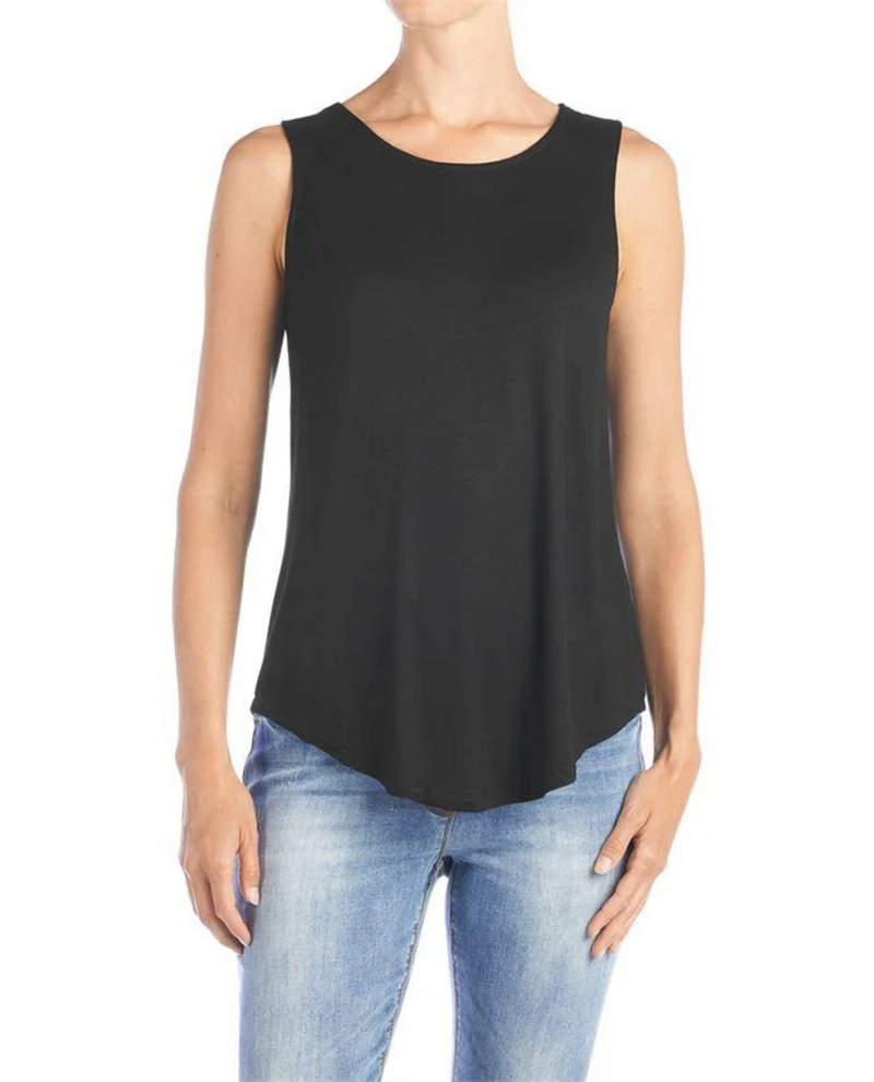 Curved hem and back pleat detail, brings ease and elegance to our sleeveless Erin Pleat Tank. Make a chic statement if worn separately or layer under your favorite jacket or cardigan. Materials: Rayon/Spandex.