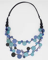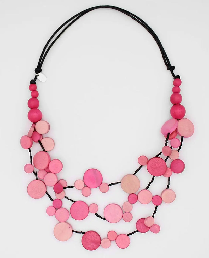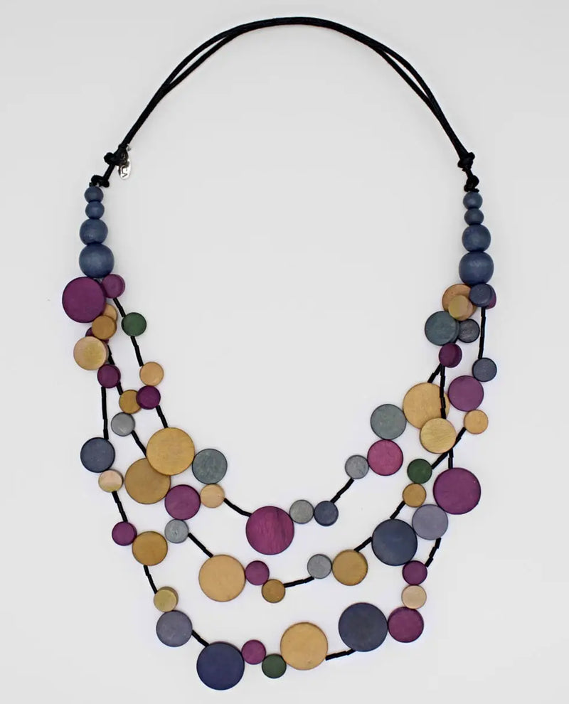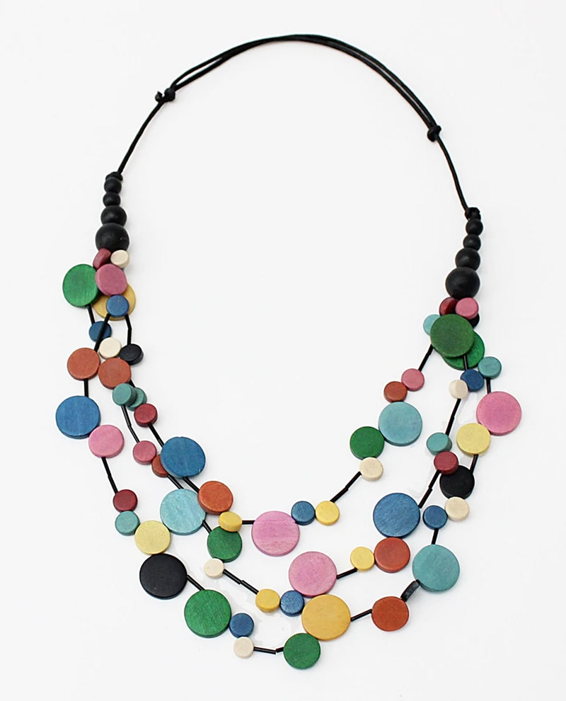 This triple strand, multi-color necklace is made to go with everything! Flat round wood beads are hand painted in a variety of bold colors and layered together on multiple strands of black wax cord. The adjustable neckline lets you choose the length you prefer. For a more casual look, wear over a simple tee, or fancy up that little black dress for a night out.