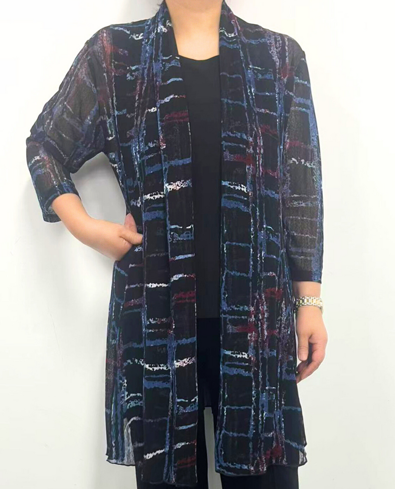 This lightweight mesh cardigan offers breathable comfort and a stylish printed design, perfect for layering on cooler days. Its airy fabric keeps you comfortable while adding a fashionable touch to any outfit. Ideal for those seeking both style and ease in their wardrobe.
