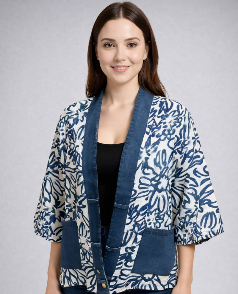 Elevate your everyday style with this versatile denim trim jacket. Designed with thoughtful details that both complement casual looks and elevate them, this piece brings effortless sophistication to your wardrobe. The classic denim trim adds visual interest while maintaining timeless appeal .Patch pockets add function, and a bottom closure secures the hem. Perfect for layering over your favorite outfits, this lightweight boxy jacket offers the comfort and durability you deserve.