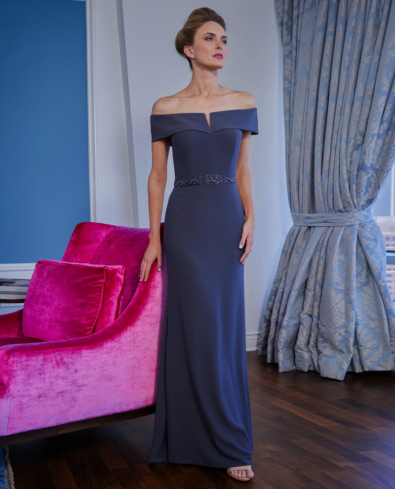 A tailored stretch soft crepe flare gown has a portrait neckline with off-the-shoulder straps and a beaded waistband. The gown has stretch lining for all-day comfort.