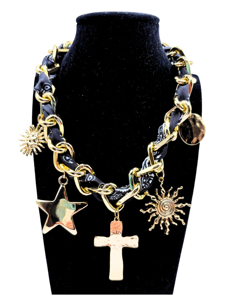The Cross/Star/Sun Scarf Necklace offers a stylish way to elevate your outfit. Combining symbolic charms and a scarf entwined with a chain, it provides a bold accessory to refresh your look.