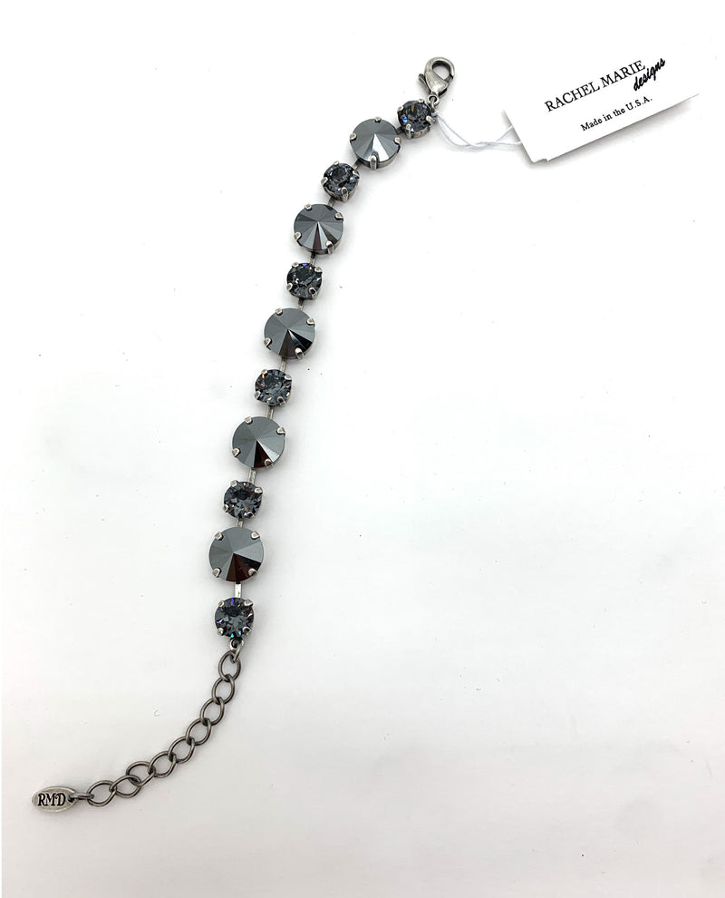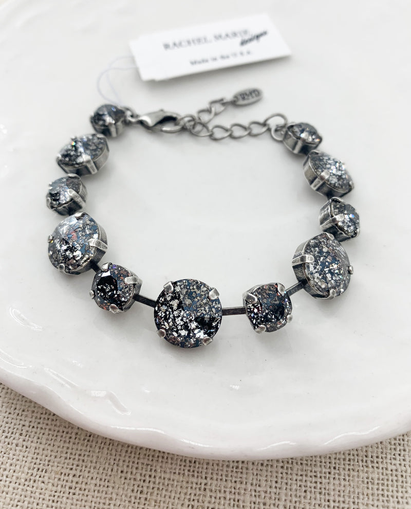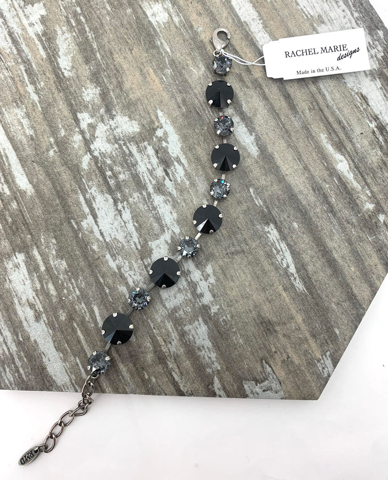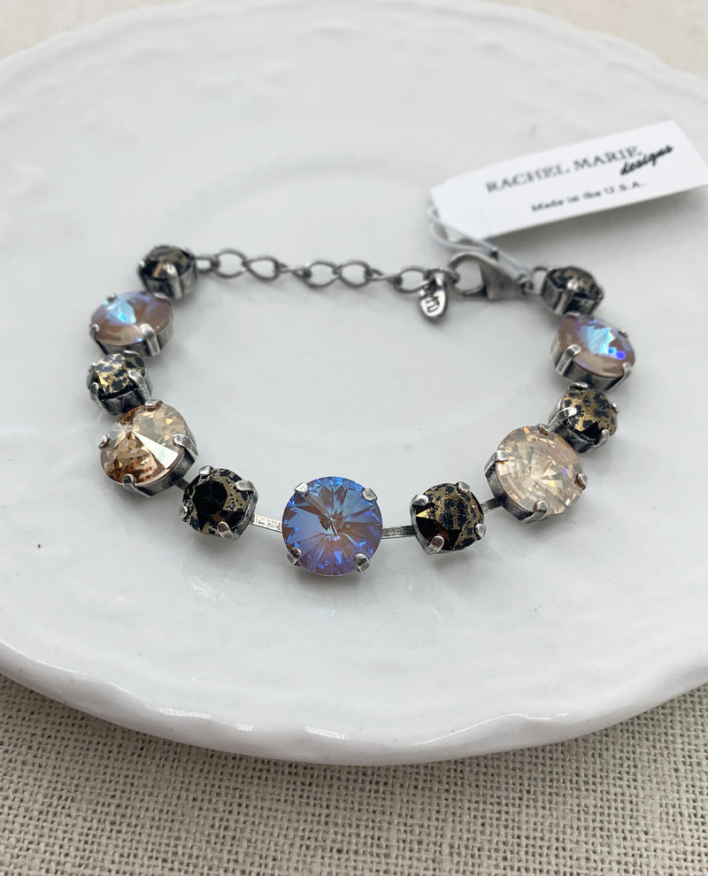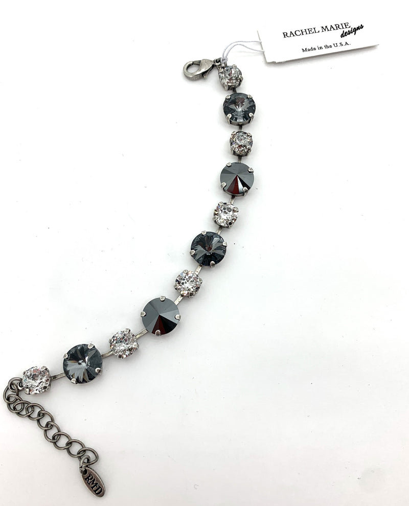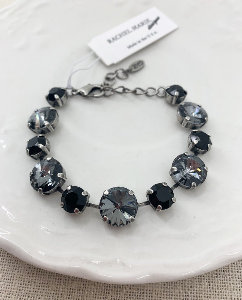 Metal: Plated in Antique SilverStones: Swarovski CrystalsClasp: Lobster Clasp Closure12mm Rivoli and 8mm Chaton BraceletAntique Silver Setting7" Length with 1.5" Extender