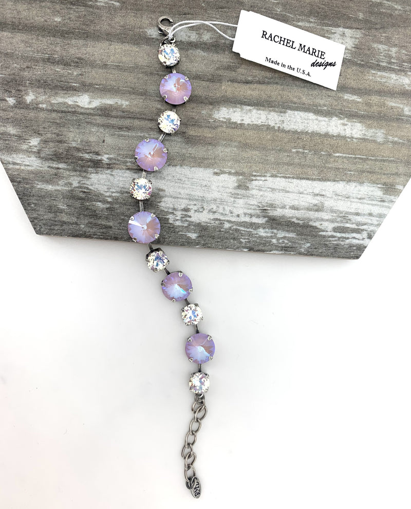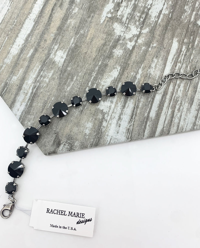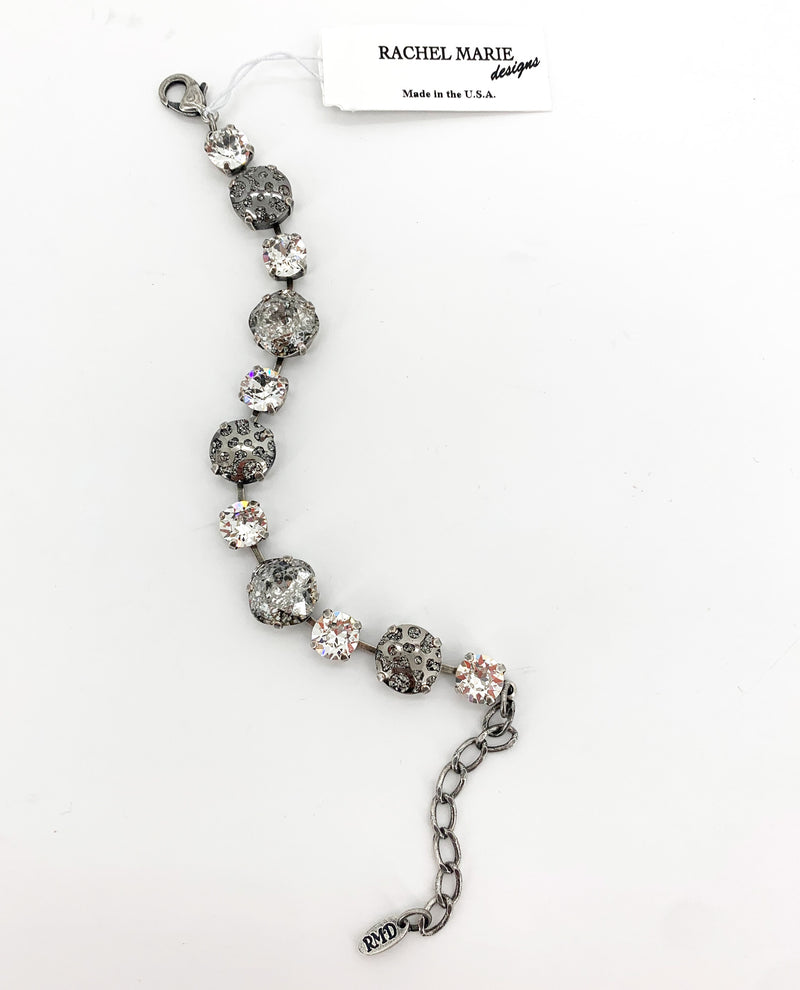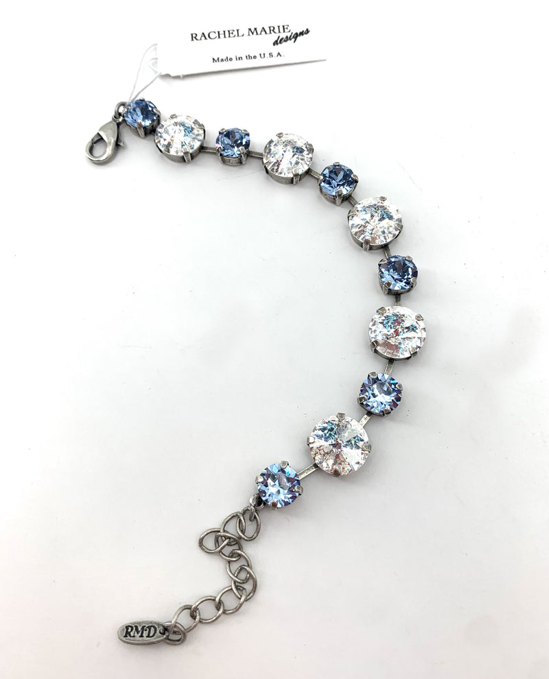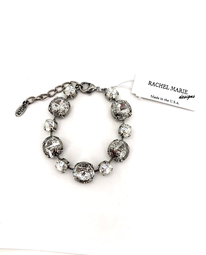 Metal: Plated in Antique SilverStones: Swarovski CrystalsClasp: Lobster Clasp Closure12mm Rivoli and 8mm Chaton BraceletAntique Silver Setting7" Length with 1.5" Extender