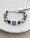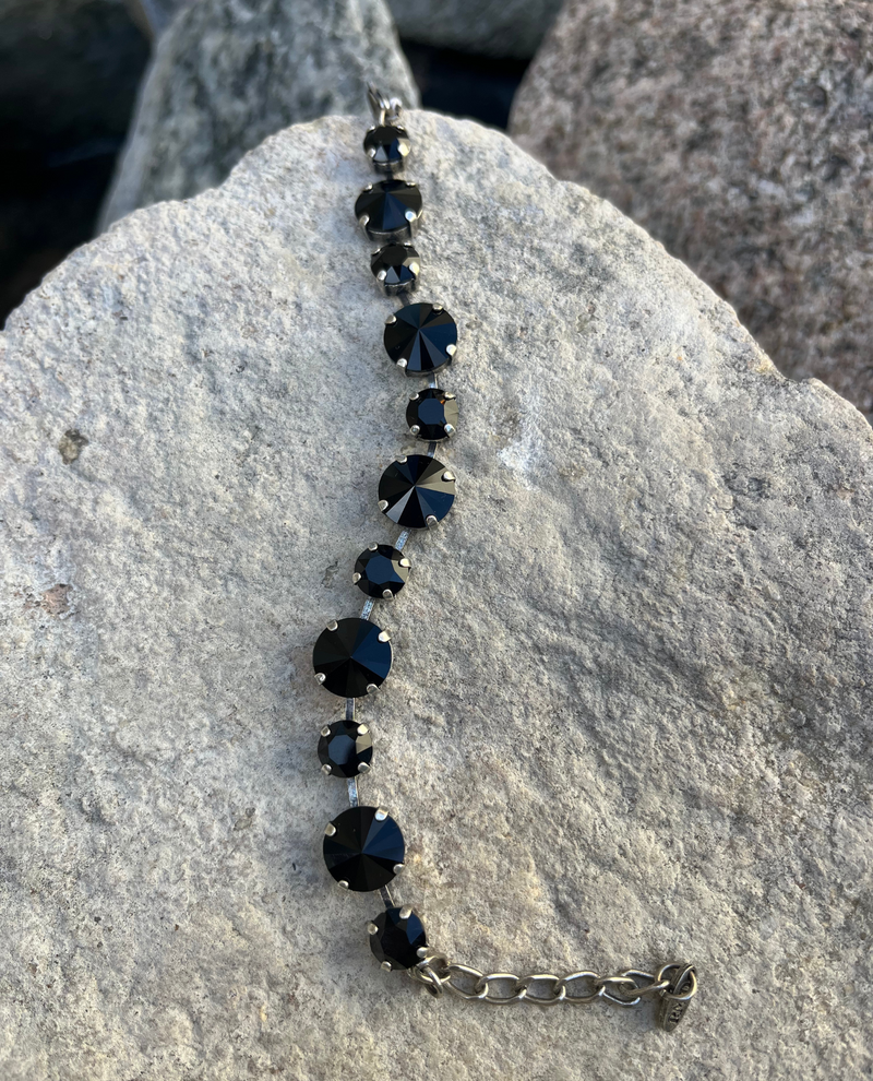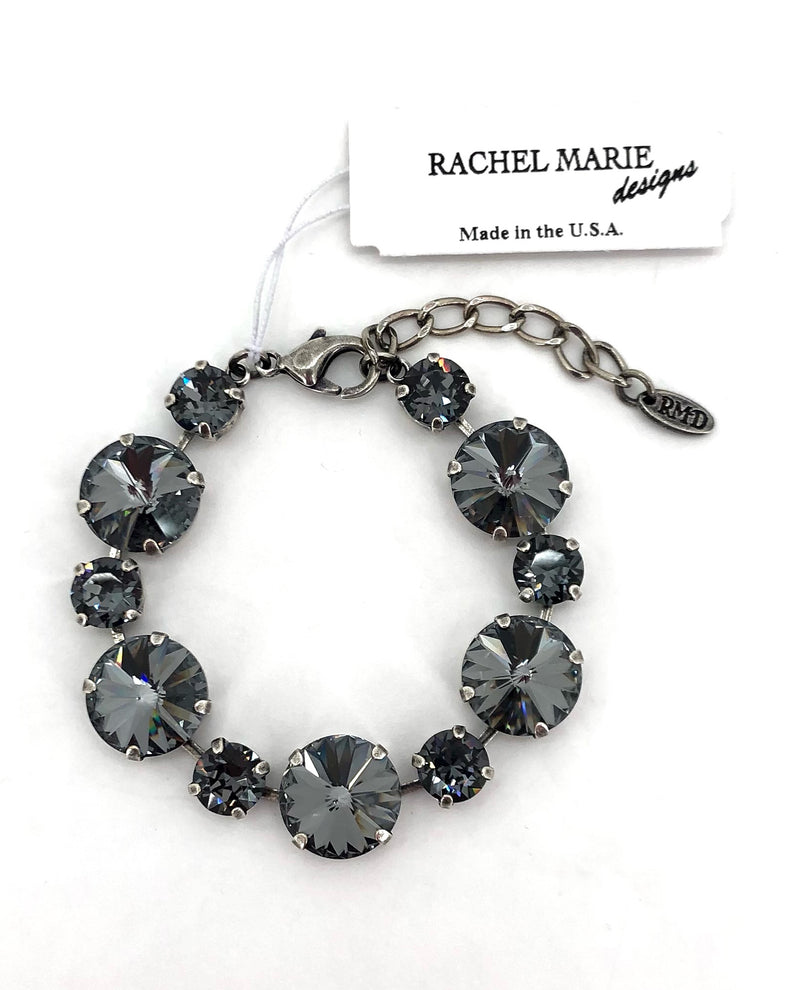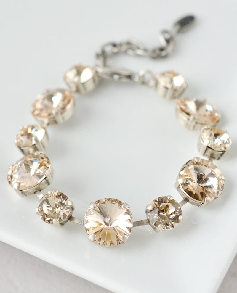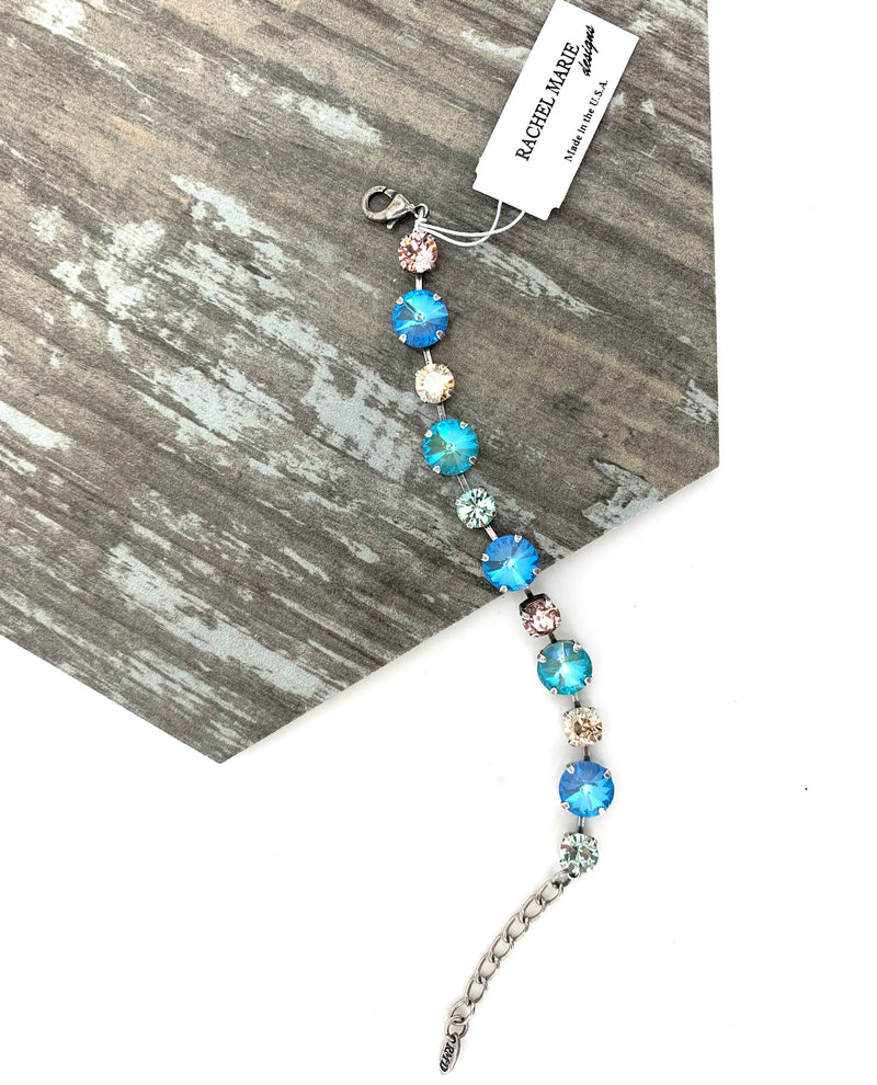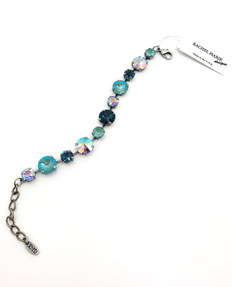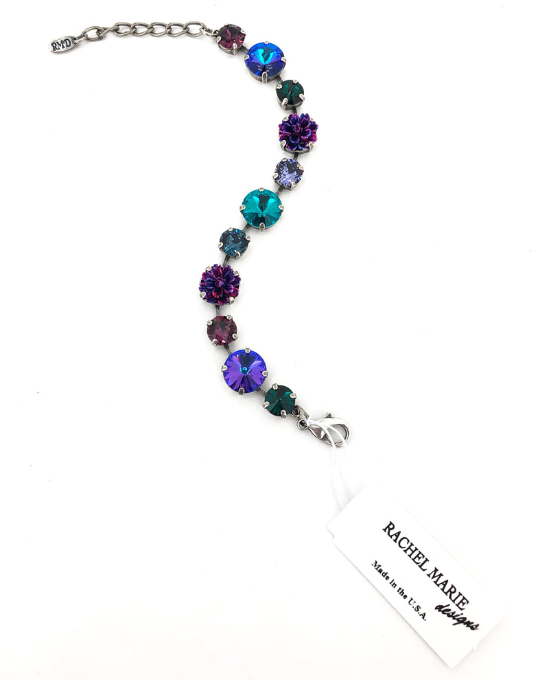 Metal: Plated in Antique SilverStones: Swarovski CrystalsClasp: Lobster Clasp Closure12mm Rivoli and 8mm Chaton BraceletAntique Silver Setting7" Length with 1.5" Extender