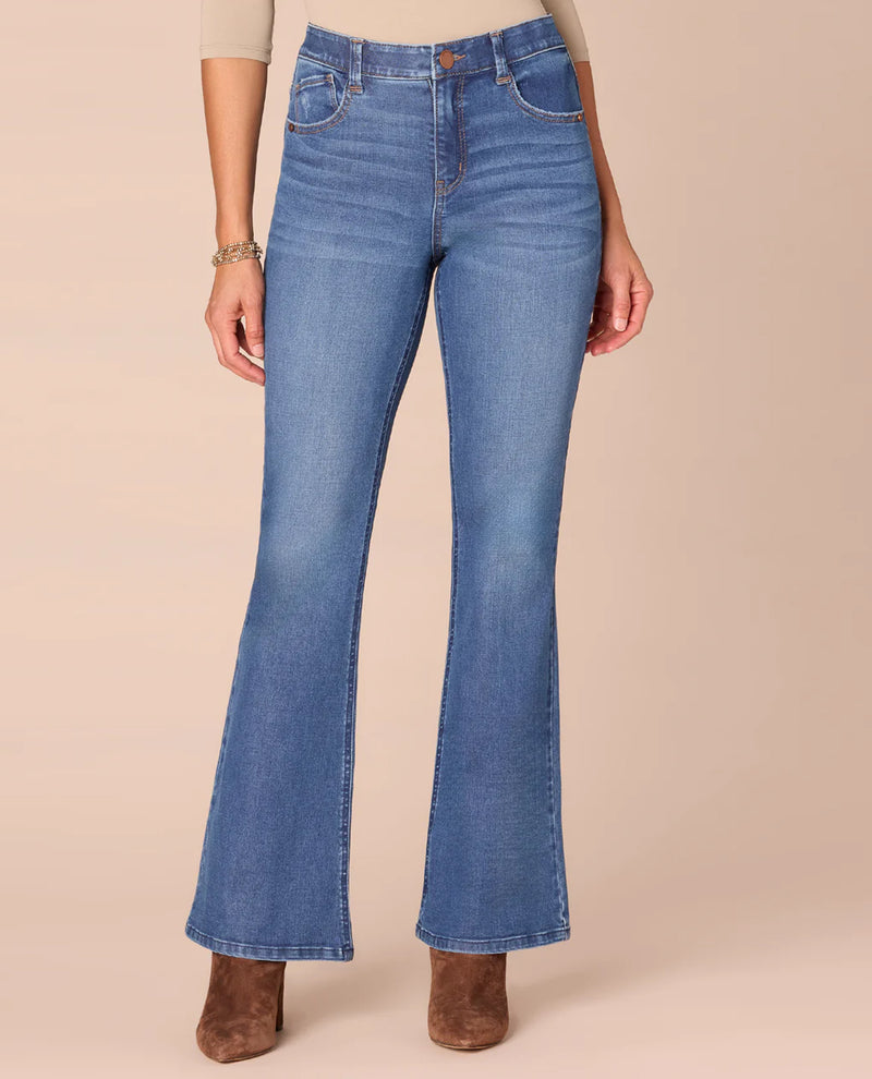 The DEMOCRACY B2485IEUR Ab Solution High Rise Flare Jean combines flattering design with comfort-focused fit technology. Its high-rise silhouette and slightly arched yoke provide natural shaping, while the Ab Solution® fit technology ensures support where you need it most. Featuring a button and zip fly closure, five-pocket styling, and subtle whiskering and fading details, these jeans offer both style and function for everyday wear.