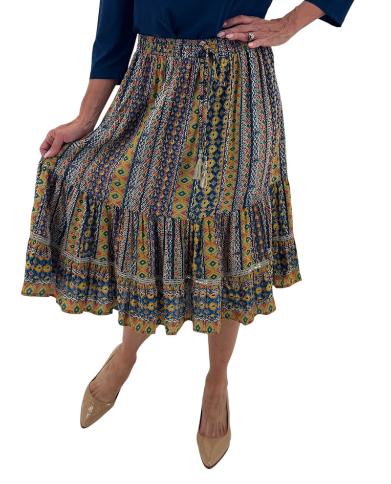 This Multi Print Skirt offers a unique blend of vibrant patterns that bring a fresh, stylish look to any wardrobe. Crafted for comfort and versatility, it pairs effortlessly with simple tops for a standout outfit. A faux drawstring adds decoration, while the elastic waist will keep you comfortable. Perfect for those who want to express their personality through fashion while staying comfortable throughout the day, this swingy tiered skirt is a winner.