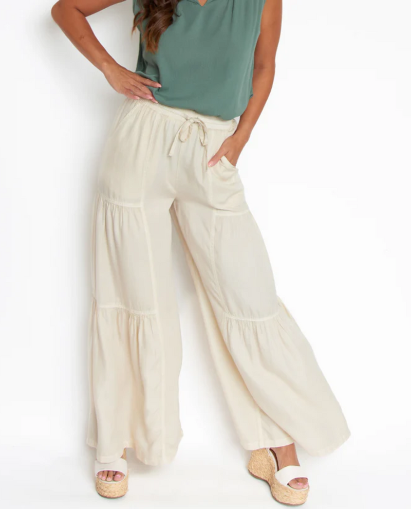 Trendy and so comfortable! The Delaney Wide Leg Tiered Chambray Pants features a lightweight Lyocell fabric with an oversized, tiered wide leg opening, elastic waistband and drawstring tie. Pair them with your favorite tee or tank for an easy, effortless look!