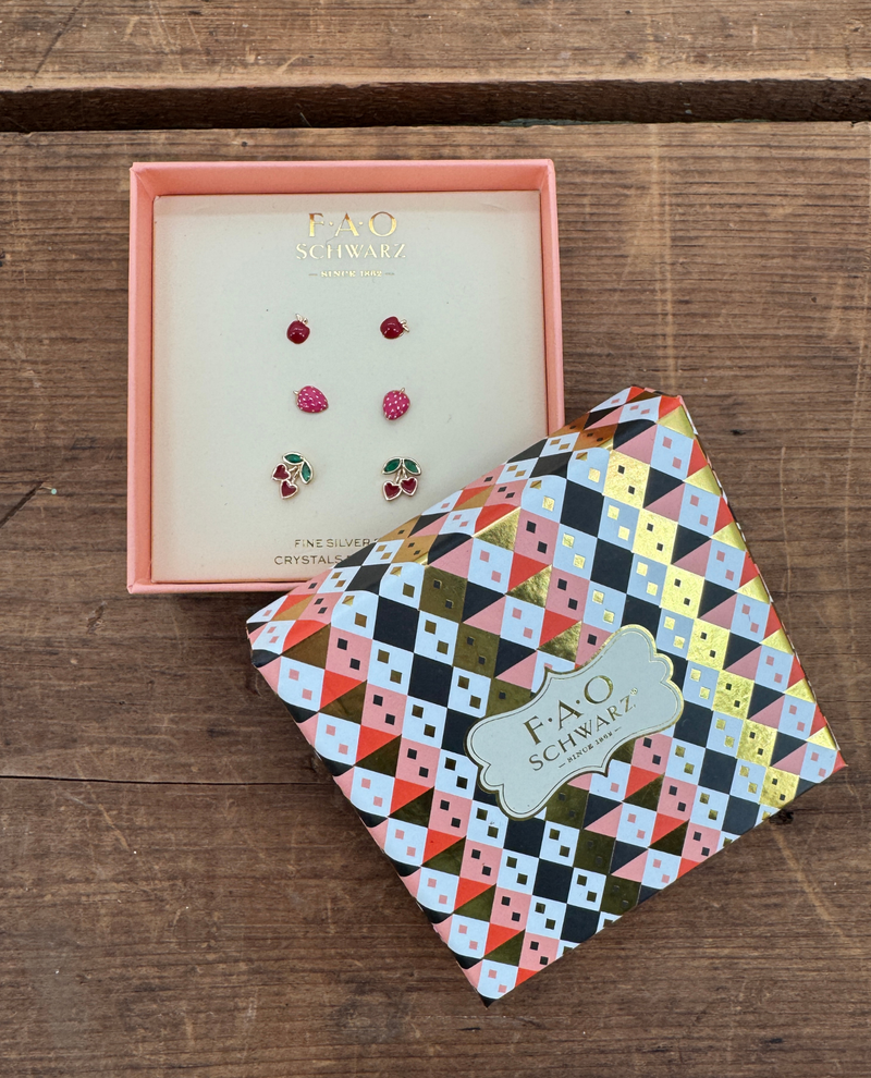 Bring a playful pop of color to your everyday look with these charming FAO Schwarz enameled fruit earrings. Each pair features vibrant, hand-painted fruit designs in rich enamel coating that captures the whimsical spirit of the iconic toy brand. Perfect for fruit lovers and nostalgia seekers alike, these lightweight earrings add a cheerful touch to any outfit. Whether you're dressing up or keeping it casual, these delightful accessories celebrate the joy of timeless style and imaginative fashion.