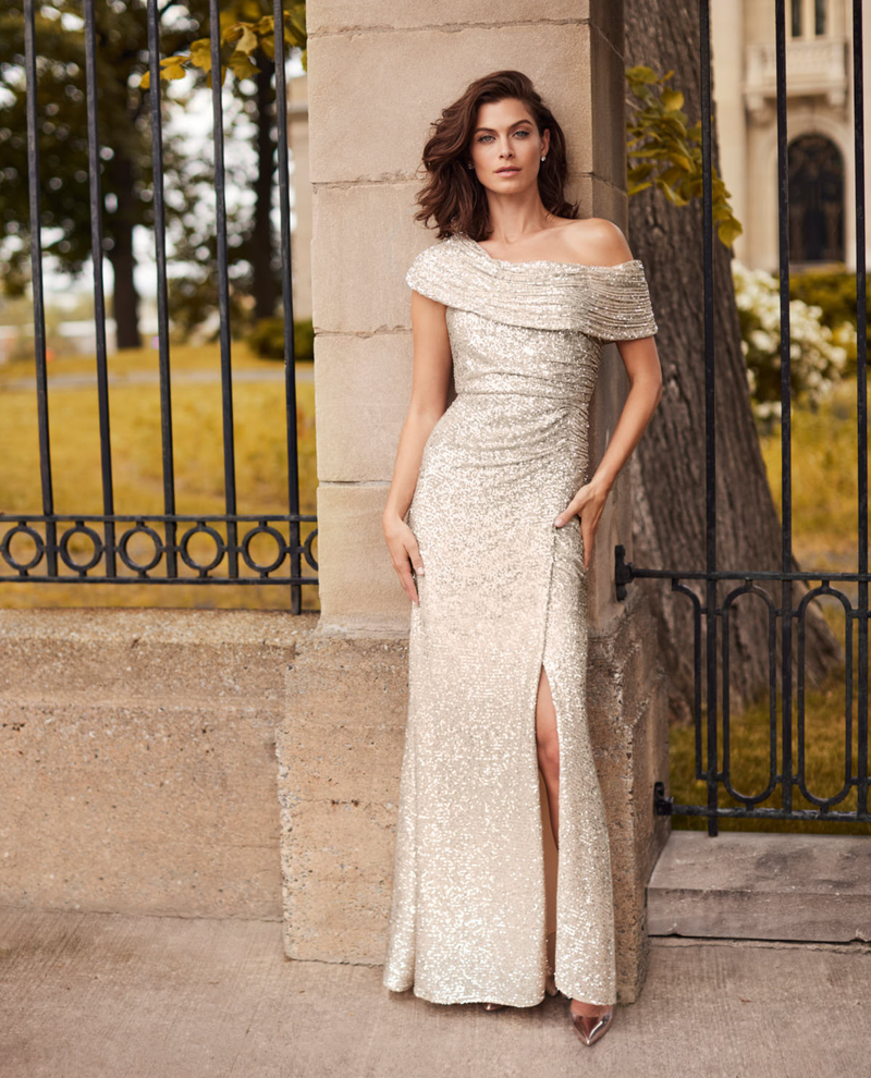 Add glamour to your evening look with this stunning Frank Lyman off-shoulder sequin dress. The shimmering sequin detailing catches the light beautifully, creating an eye-catching sparkle perfect for special occasions. The unique neckline covers one shoulder and drapes over the other arm, offers a sophisticated, flattering silhouette that's both elegant and modern. Whether you're heading to a gala, cocktail party, or celebration, this dress delivers glamour and confidence in every wear.