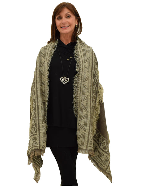 This blanket scarf has a fun Southwest look. Fringe accents the geometric pattern, and a semi-sheer stripe in the middle completes this casual wrap.