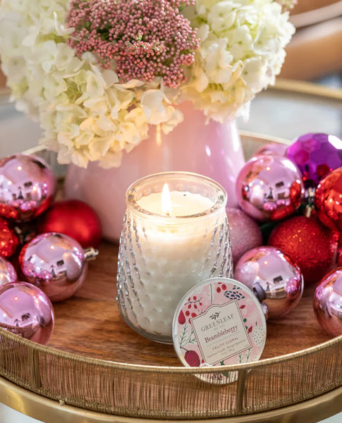 With a clear, glass hobnail textured jar and a silver lid, this Signature Candle is the perfect match for any style. Fill your home with inviting Greenleaf fragrances that make any space feel cozy!