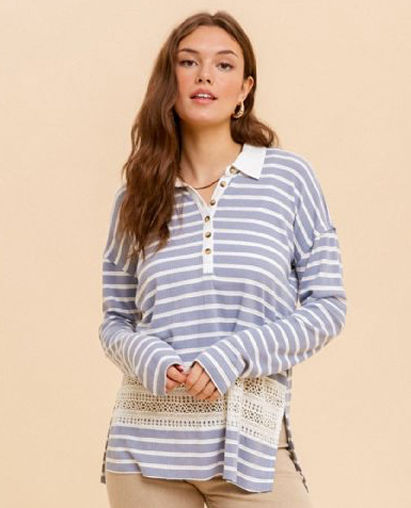 Discover the perfect balance between elegance and comfort with the HEM & THREAD 32016 LACE CONTRAST OVERSIZED SHIRT. Made with intricate crochet lace contrast and stylish stripe print, this oversized shirt is perfect for any occasion. Add a touch of sophistication to your wardrobe and elevate your style.