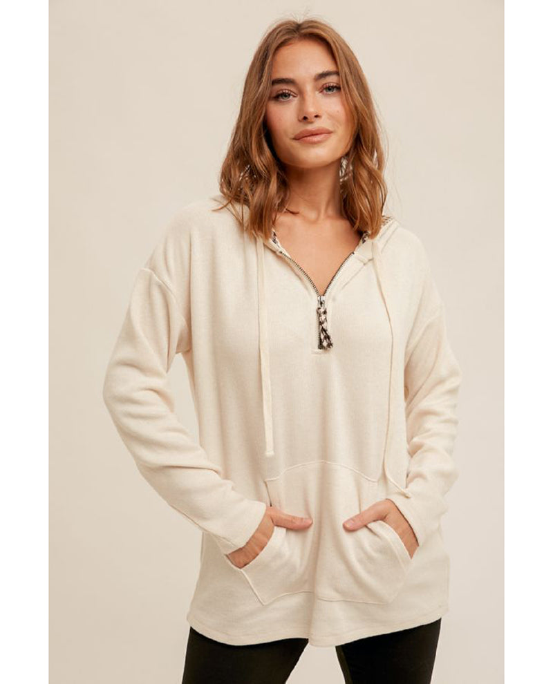 The Hem & Thread 37401 Hooded Knit Top with Pocket offers cozy comfort and practical style. Crafted from soft knit fabric, this top features a convenient front pocket and a hood for added warmth. Its relaxed fit makes it perfect for layering or wearing on its own, providing ease and versatility for your everyday wardrobe.