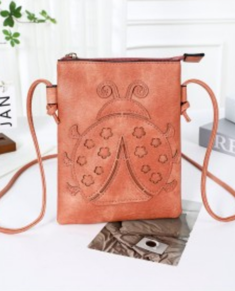 Available in fun colors, this crossbody bag features a sewn-on ladybug motif made with cut material. The phone-sized back slip pocket is practical, and you'll be impressed by how much you can fit into the main compartment of this small bag. A long, thin strap makes this easy to carry.