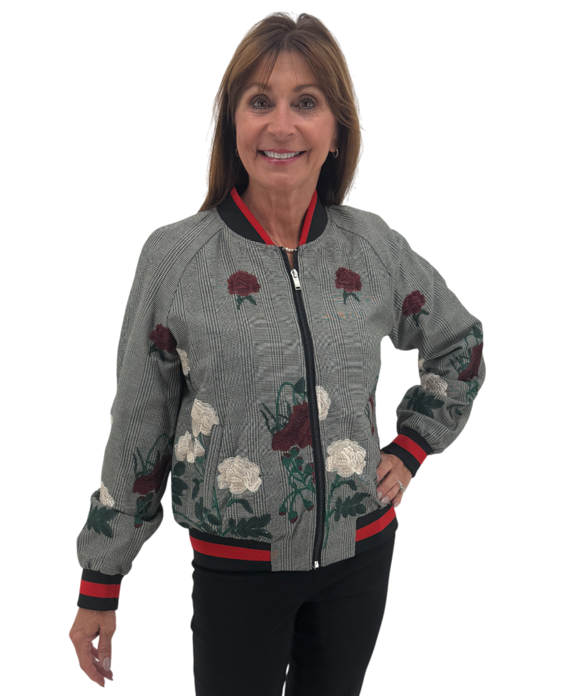 Elevate your wardrobe with this stunning INSIGHT floral plaid jacket that seamlessly blends a classic shape with contemporary style. The thoughtful combination of floral and subtle plaid elements creates visual interest while remaining versatile enough to pair with your favorite basics. Red and black stripe trim adds a fun contrast.