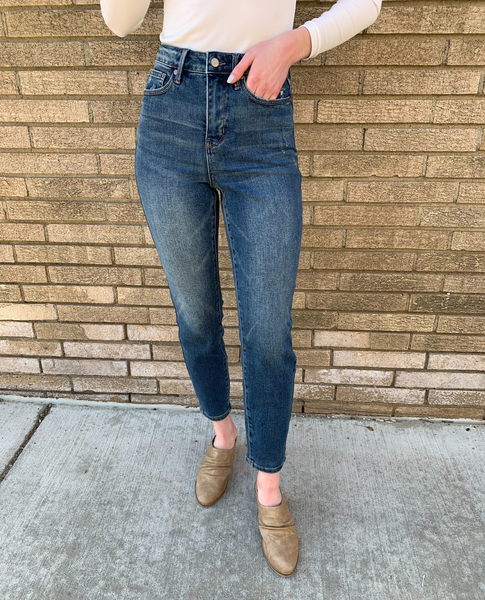 You'll feel like a million bucks in these high rise jeans with tummy control technology. The slim leg is the perfect modern compromise between straight legs and skinny jeans. A little destruction on the pockets adds another contemporary element. With just a touch of spandex, they'll keep you comfortable while maintaining their shape.