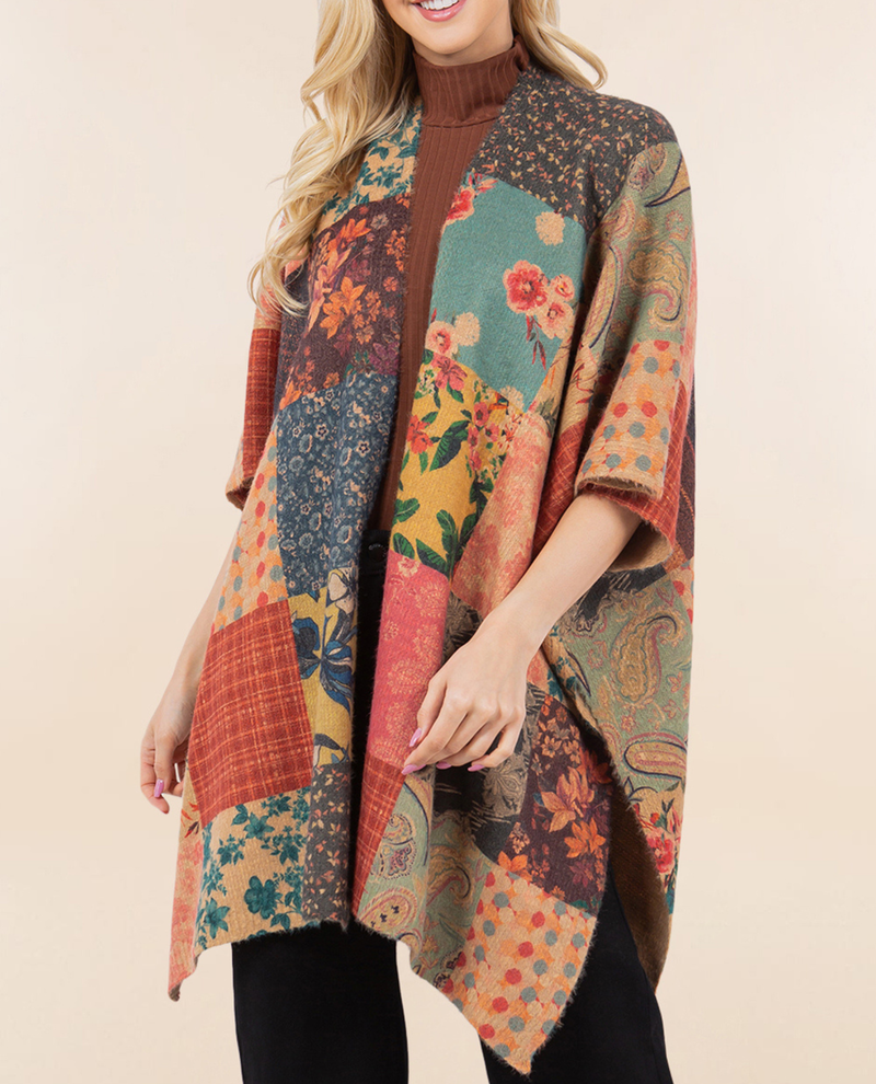 This kimono has a sweet patchwork print that gives it a fresh look. Vibrant colors and lovely floral prints are cheerful to wear in any season. This kimono is made of a light sweater knit and has an open front and short sleeves.