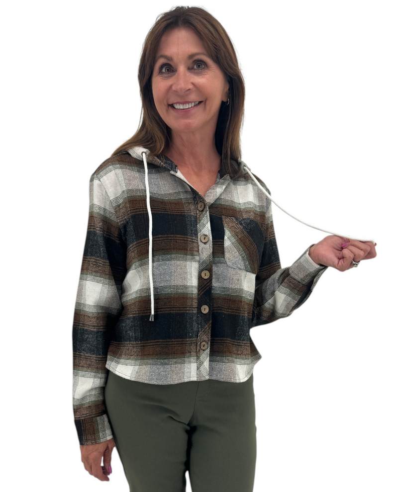 Stay comfortably stylish with the adorable Keren Hart Button Front Hooded Jacket. Designed for ease and versatility, this jacket features a convenient button-front closure and a cozy hood for added warmth. The cropped length is perfect for ladies of petite stature or who are short waisted. The jacket is slightly shaped and has a shirt tail hem. For a quality touch, the drawstring has dark cone-shaped tips.