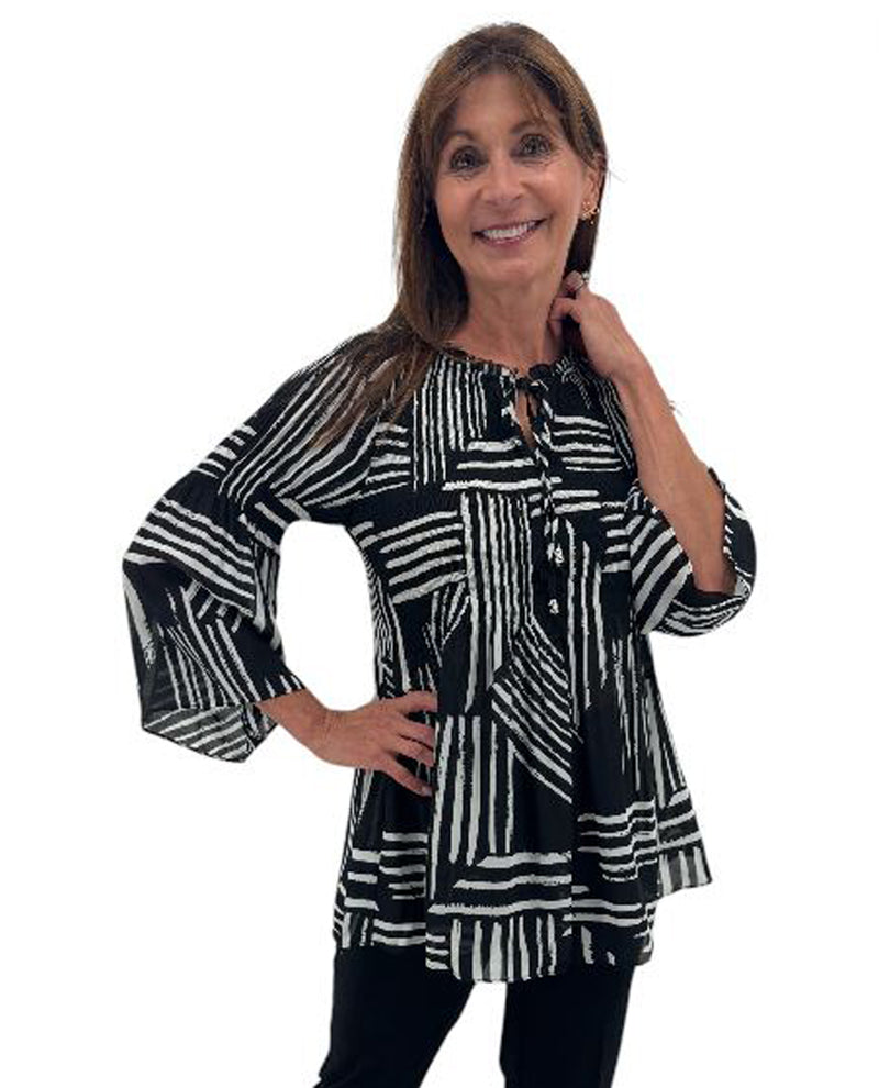 The KEREN HART Pleated Bell Sleeve Blouse combines elegance with comfort through its flowing three-quarter bell sleeves and delicate pleated design. Crafted to add a graceful silhouette to your wardrobe, this blouse offers a flattering fit that moves effortlessly with you. The keyhole front neck line secures with a tie.