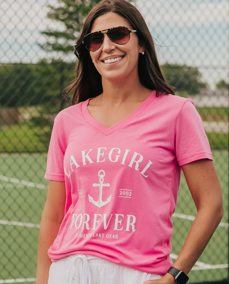 We love the energy of this new hot pink Lakegirl tee! It has a classic fit, long hem and a flattering V neck. The opaque fabric is lightweight, making it perfect for outdoor summer days. The front graphic proudly declares that you're a "Lakegirl forever."