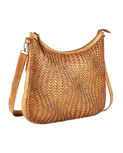 A leather weaving shopping bag with a wave effect is created by using different width strips for weaving the leather on this hand crafted leather bag.
