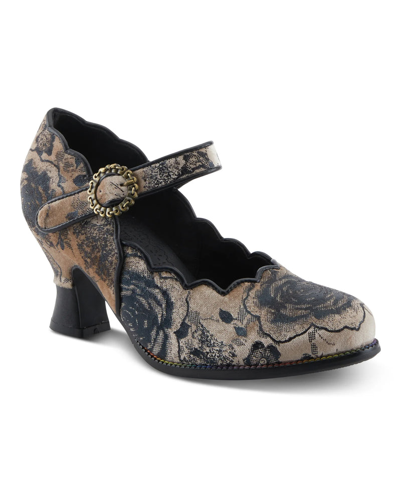 The L'ARTISTE ADODORA PRINT vintage-style shoe showcases a luxurious velvet and leather upper, blending colors and textures with scalloped edges for a distinct look. Its ornate antique-inspired buckle pairs with an adjustable hook-and-loop closure for easy wear. The 2 3/4" sculpted heel offers a comfortable lift, making this shoe both stylish and supportive—perfect for adding a sophisticated, artistic touch to your everyday wardrobe.