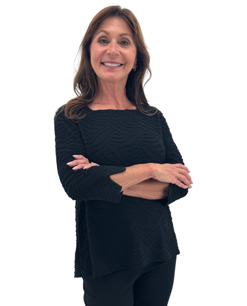 The Leo and Nicole Petite Textured Square Neck Top offers a modest square neckline that enhances your silhouette with a modern touch. Designed specifically for petite sizes, this top provides a comfortable, tailored fit without excess fabric. Its subtle textured fabric adds visual interest while remaining versatile enough for both casual and dressy occasions. Slits in the sleeves and a flattering A-line shape help make this a knock-out basic.