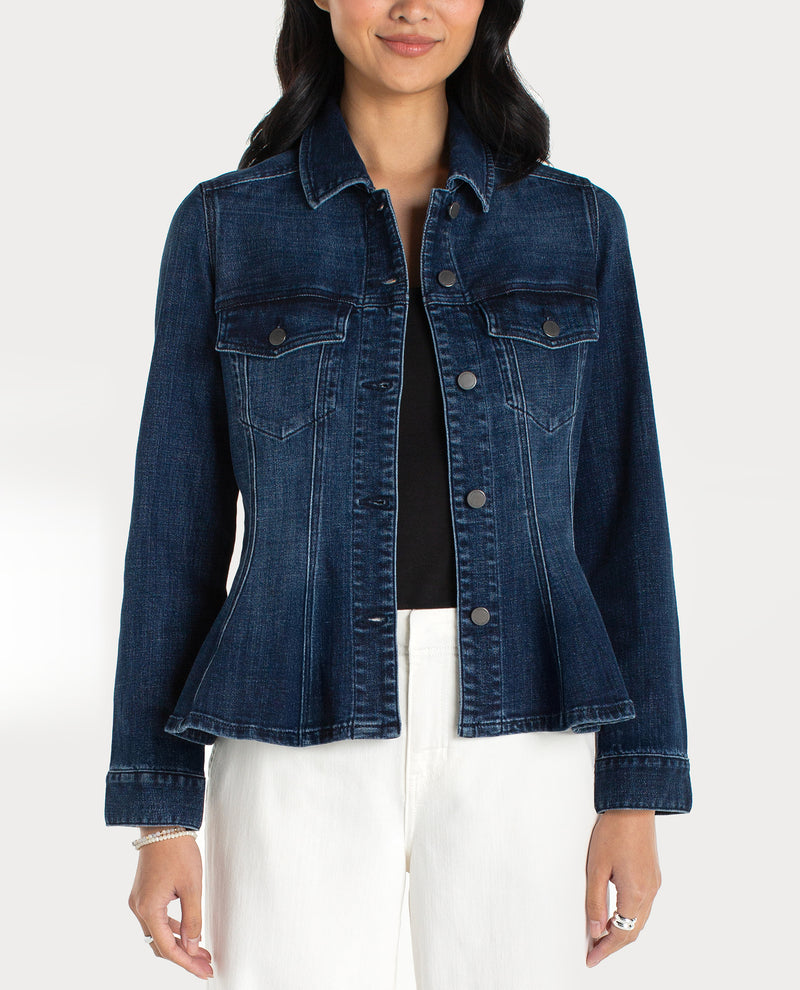 Elevate your denim game with this stunning fit and flare denim jacket. Designed to complement your silhouette, the tailored fit through the shoulders and chest flows into a flattering flared hem that adds movement and dimension. Perfect for layering over dresses, tees, or sweaters, this versatile piece transitions seamlessly from casual weekends to dressed-up evenings. The classic denim construction ensures durability and timeless style, while the structured cut keeps you looking polished and put-together. A wardrobe essential that works as hard as you do.