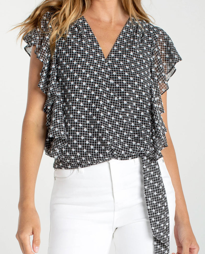 This draped front top features a soft V neckline and short ruffled sleeves for an easy, feminine look. Designed in a black and white plaid swiss dot, it offers subtle texture and visual interest. The waist tie creates a flattering shape, while the smocked back waistband adds comfort and flexibility. Double layered for coverage and ease, this top styles effortlessly with denim or tailored bottoms.