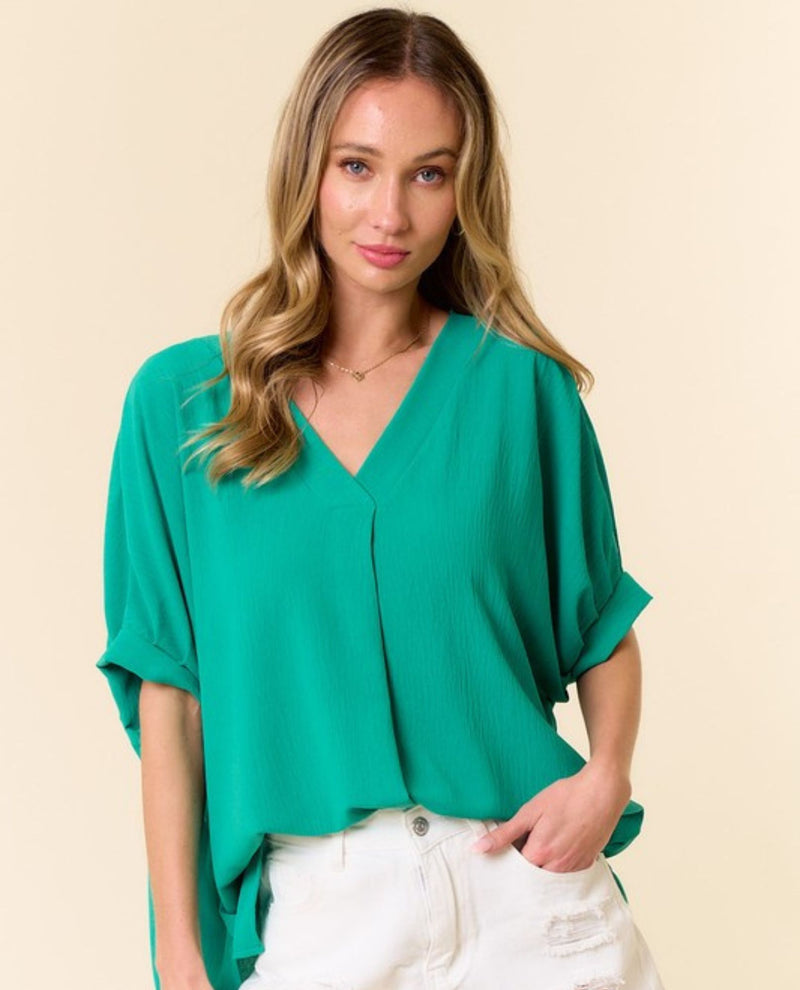 Our Devoted to you top, is made of a soft and flowy polyester material. Features a banded V neckline, short sleeves with pleat details that add a feminine touch to this top.