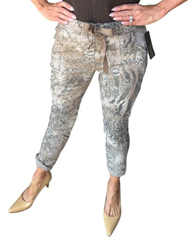 Experience unmatched style and comfort with these MADE IN ITALY 21506 Floral/Animal Print Jeggings. Crafted with premium stretch fabric, they offer a flattering fit for a range of sizes and vibrant prints that bring your wardrobe to life. Complete with pockets, these bow front jeggings combine fashion and function effortlessly.